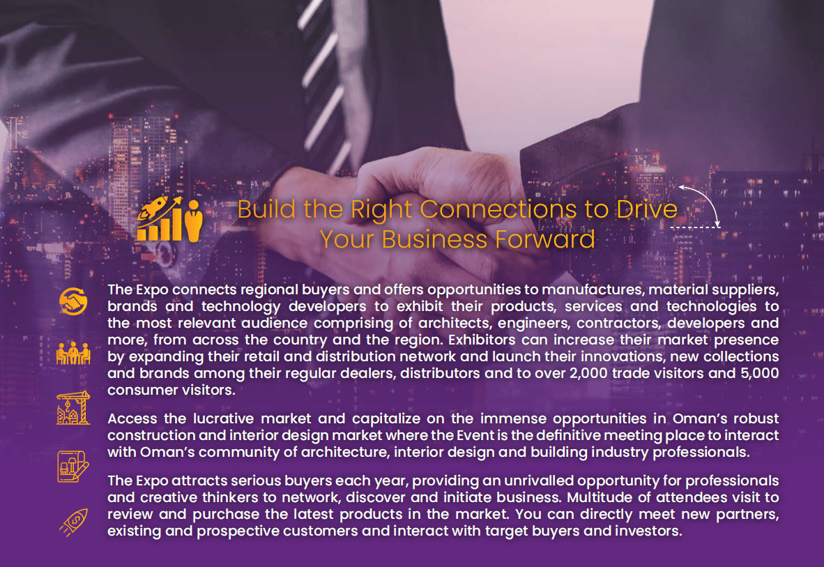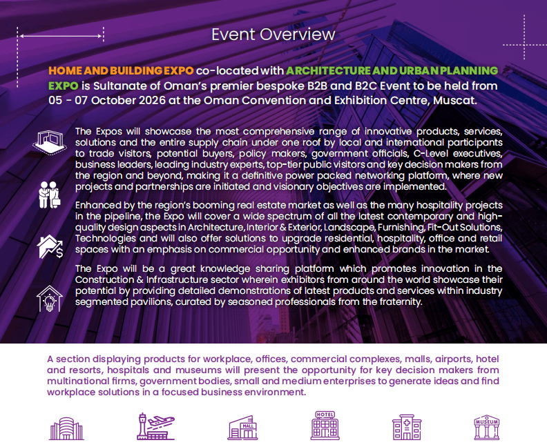 动作阿曼苏丹邦首屈一指的定制化B2B与B2C调和型展会,本届展览会由阿曼住房与都市经营部、Muscat Expo展览集团合伙打制,而中贸邦际展览(北京)有限公司动作中邦区独家代劳,将依赖15年境生手业展会运营体会,为中邦参展企业搭筑高效对接平台。无论是寻求新订单的中小企业,依然构造中东商场的龙头企业,都能正在这里找到精准的配合资源与商场冲破口。